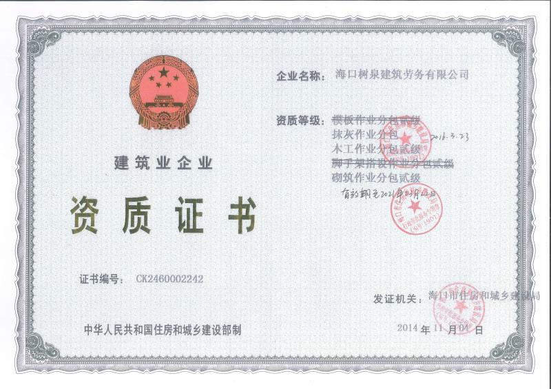 海口樹泉建筑勞務有限公司成立于2011年,公司位于???,其前身是一家專業建筑施工隊,自2004年即開始在海南從事建筑勞務施工。自成立至今,公司已經擁有一支科學管理、質量過硬、能打硬仗,搶工期的專業隊伍。能獨立承擔大中型工業與民用建筑 、室內外裝修、各類機電設備安裝工程。代表工程有??跒I海華庭、三亞時代海岸T01/02/04/05棟高層、合肥東海花園二期、陵水富力灣B區高層、三亞金中海(酒店)、瓊海大印經典花園、??诃h球海景大酒店(四星級酒店,在建中)、陵水珍珠大廈(五星酒店)、??谌f達廣場、美蘭機場二期。